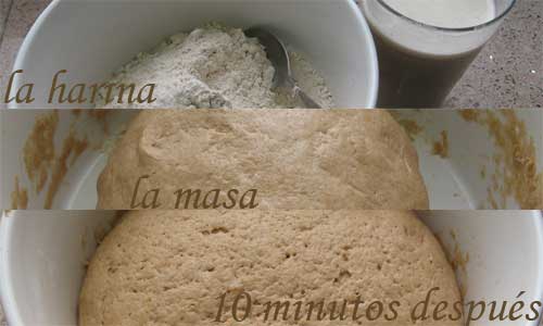 Como he comentado en anteriores artículos, esta harina no necesita tanto amasado, los ingredientes se integran como por arte de magia en pocos minutos y sin gran esfuerzo, posteriormente, su levado también es en un tiempo realmente reducido, en la receta que nos dieron en el cursillo, indicaba 5 minutos de levado y como me ha parecido muy poco, la he dejado 10, pues bien, seguro que con 5 habría sido suficiente.