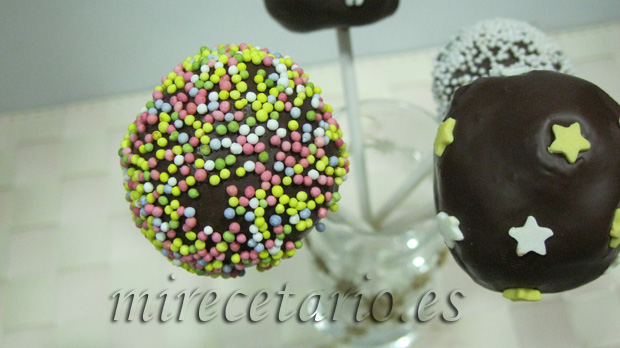 - Fundir un poco de chocolate en un vaso, untar los palitos de los cake-pops, (unos palos de brochetas pueden servir) y clavarlos en las bolitas con cuidado de no romper. Clavar en un corcho o similar para que queden de pie y sin tocarse, podéis dejarlas en vasos altos sin mas y llevar a la nevera nuevamente para que se endurezca y poder darles el baño de chocolate sin que se nos caigan del palito.