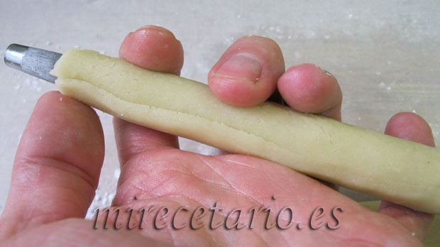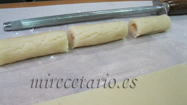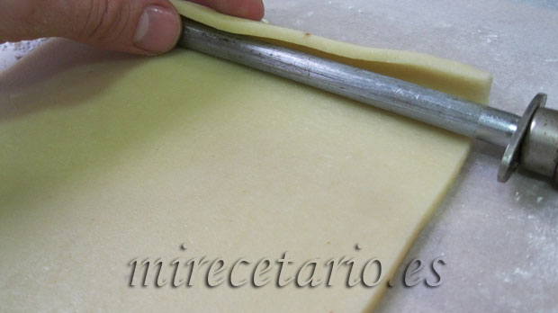 - Estirar la masa y enrollar para hacer los rulos, yo he utilizado un afilador de cuchillos, dar una vuelta, cortar la masa y apretar con la mano para igualar la masa ya que se podrían hacer pequeñas grietas al enrollar.
