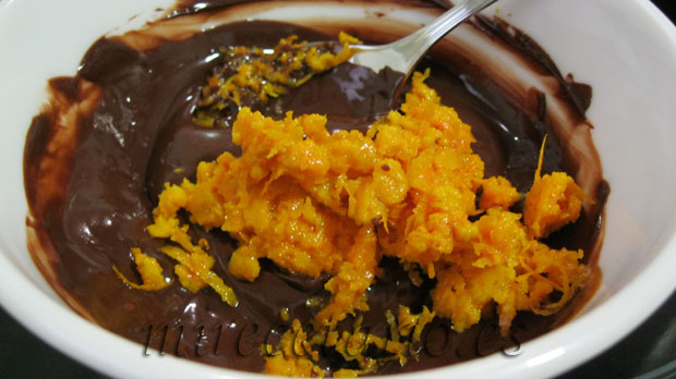 - Ahora vamos a hacer la crema de chocolate, fundir el chocolate con la mantequilla y mezclar, agregar la ralladura de naranja y meter en una manga pastelera.