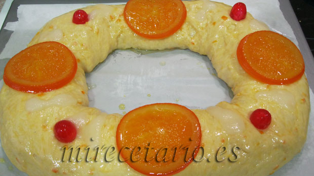 - A la mañana siguiente, retira el papel film con mucho cuidado, pincela el roscón nuevamente con huevo batido y decora con las frutas escarchadas y el azúcar humedecido con unas gotas de agua o anís.