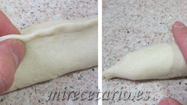 - División y formado de los panes; corta la masa en trozos de unos 120 gramos aproximadamente, a mi me salieron 7 panecillos, con cada panecillo, estira, pliega, gira, estira y… vamos ya con el formado del pan, enrolla la masa sin presionar mucho pero evitando dejar aire dentro y sella la unión final pellizcando la masa, haz rodar el panecillo para dar esa forma acabada en punta que se ve en la foto.