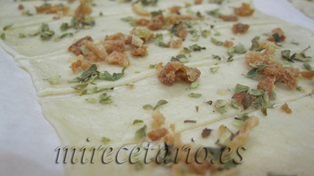 - Precalentamos el horno a 200 grados con la bandeja dentro, cortamos la masa con un corta pizzas en tiras y dejamos tal cual sin separar ni nada, en el horno ya se formarán bien.