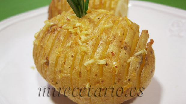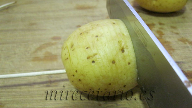 Pues anímate a cocinar estas patatas que son muy buenas y más fáciles de hacer de lo que parece, si tienes problemas para pinchar la brocheta, pon la patata sobre una cuchara que se consigue el mismo efecto, yo lo hice con la brocheta por el tamaño de la patata que eran un poquico más grande de lo deseado. Besicos.