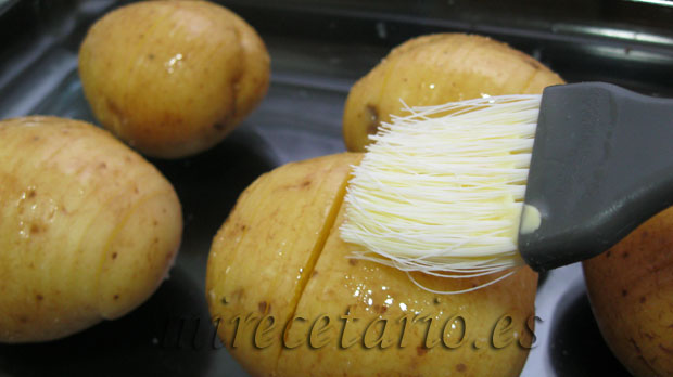 - Fundimos en el microondas 20 g de la mantequilla y pincelamos las patatas, horneamos 30 minutos a 180 grados, verificar con un palillo que están cocinadas.