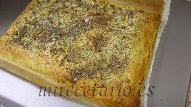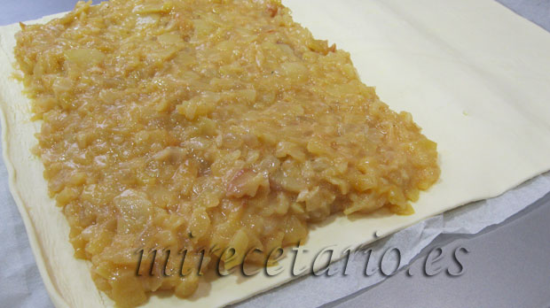 - Extender el relleno sobre la mitad del hojaldre, pincelar con agua, cerrar con la mitad que queda libre del hojaldre y sellar con un tenedor como si se tratase de empanadillas.