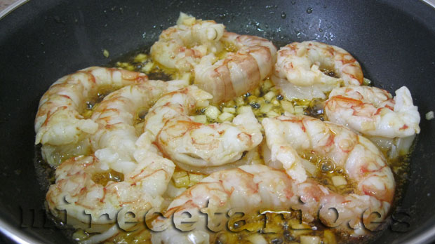 2. Ahora vamos con las gambas, las ponemos en una sartén con un poco de aceite y los ajos picados, cuando estén hechas, retiramos del fuego, agregamos la salsa de gambas y los berberechos y reservamos.