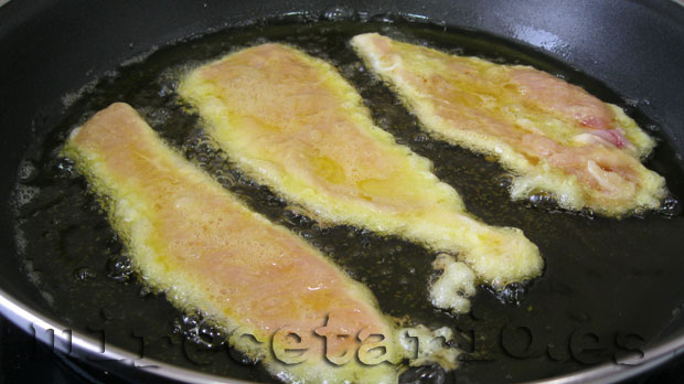 - Rectificamos de sal, echamos los guisantes escurridos y las pechugas que teníamos rebozadas.