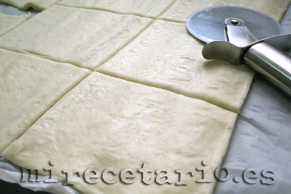 - Cortar la masa de pizza en cuadrados de unos 10 cm de lado aproximadamente, la pizza Trattoria Alfredo es perfecta para esta elaboración ya que es una masa rectangular.