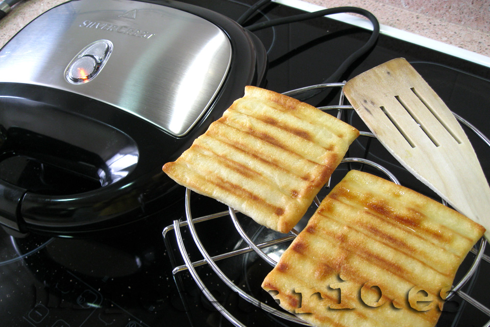 - Encender la sandwichera (poner la parrilla si tienes mi modelo de aparatico, (ver fotos del paso a paso, sí también lo compré en Lidl, jejeje)) y poner los trocitos de pizza, cinco minutos por cada lado o hasta que se doren, (ya verás como te gusta el invento…)