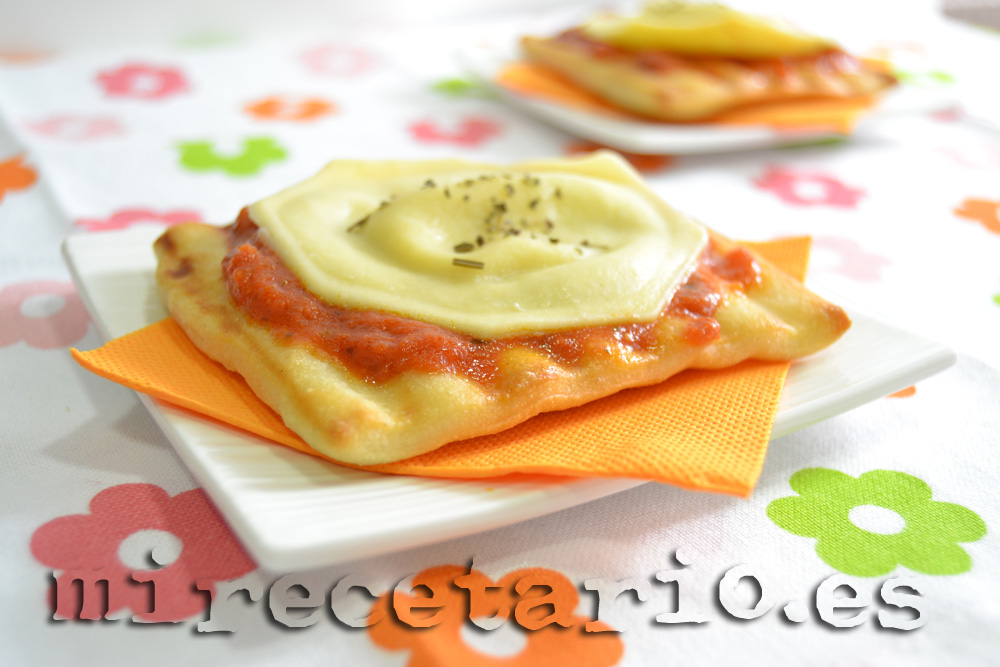 - Montar las mini pizzas con muy poca salsa ¡que pica!, un ravioli encima y un poco de albahaca molida ¡y eso es todo!