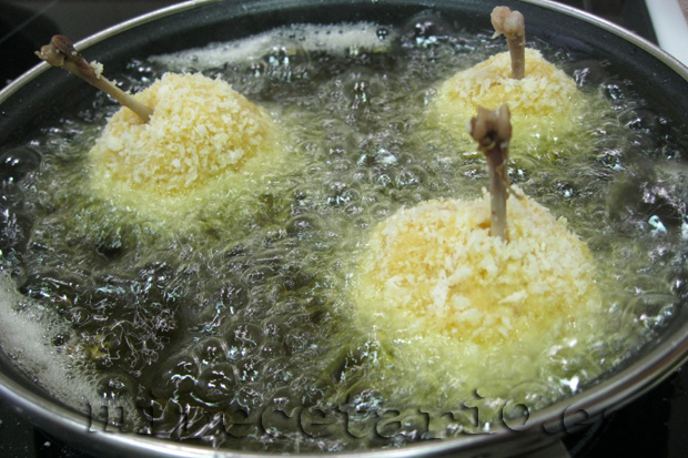 - Clavar un huesecico y freír en abundante aceite bien caliente.