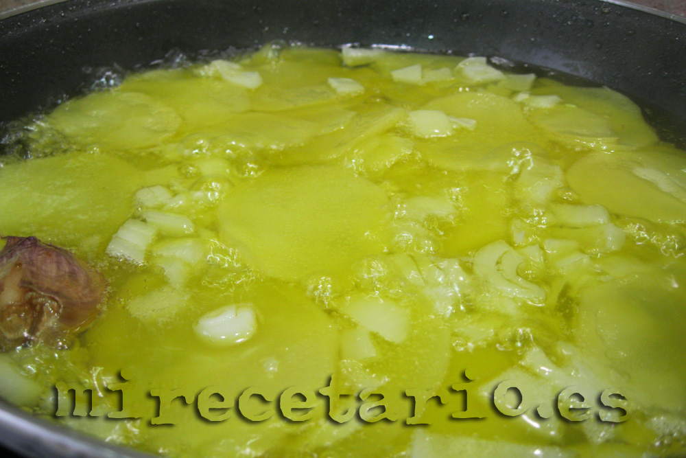 - Pelar y cortar las patatas con mandolina para que queden muy finitas, picar la cebolla, poner todo junto con el diente de ajo entero en una sartén con aceite a fuego medio hasta que se cocine (yo lo hice en tandas que no me cabía todo).