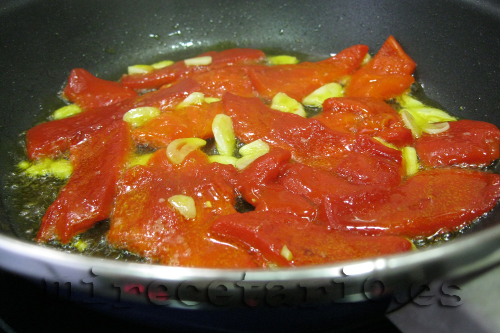 - Para hacer la salsa de piquillos, escurrir la lata de pimientos y pasar los pimientos por la sartén con los dientes de ajo laminados y un hilo de aceite.