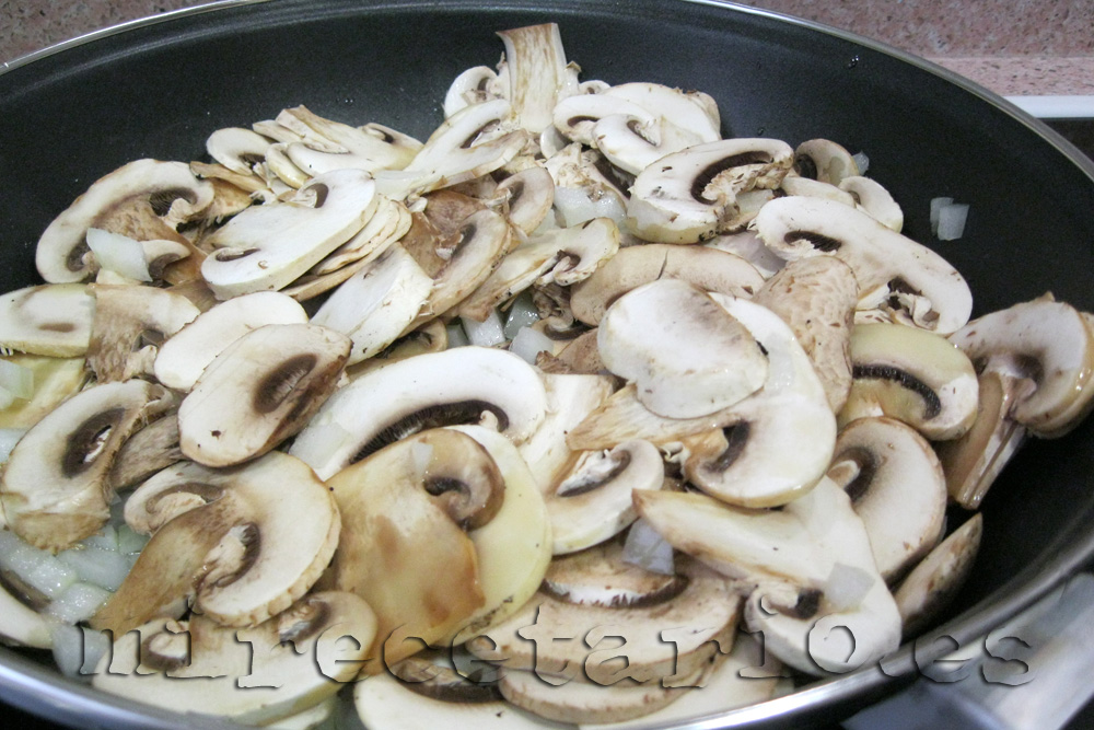 - Laminar los champiñones y picar la cebolla, pocharlo todo junto en una sartén con un hilo de aceite, sazonar y cuando esté hecho, añadir el paté (fuera del fuego).