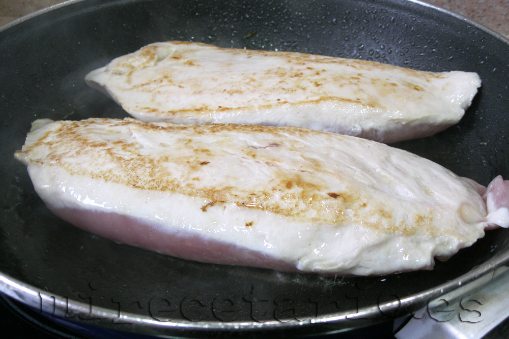 - Sazonar y marcar las pechugas de pavo en la plancha a fuego muy fuerte.