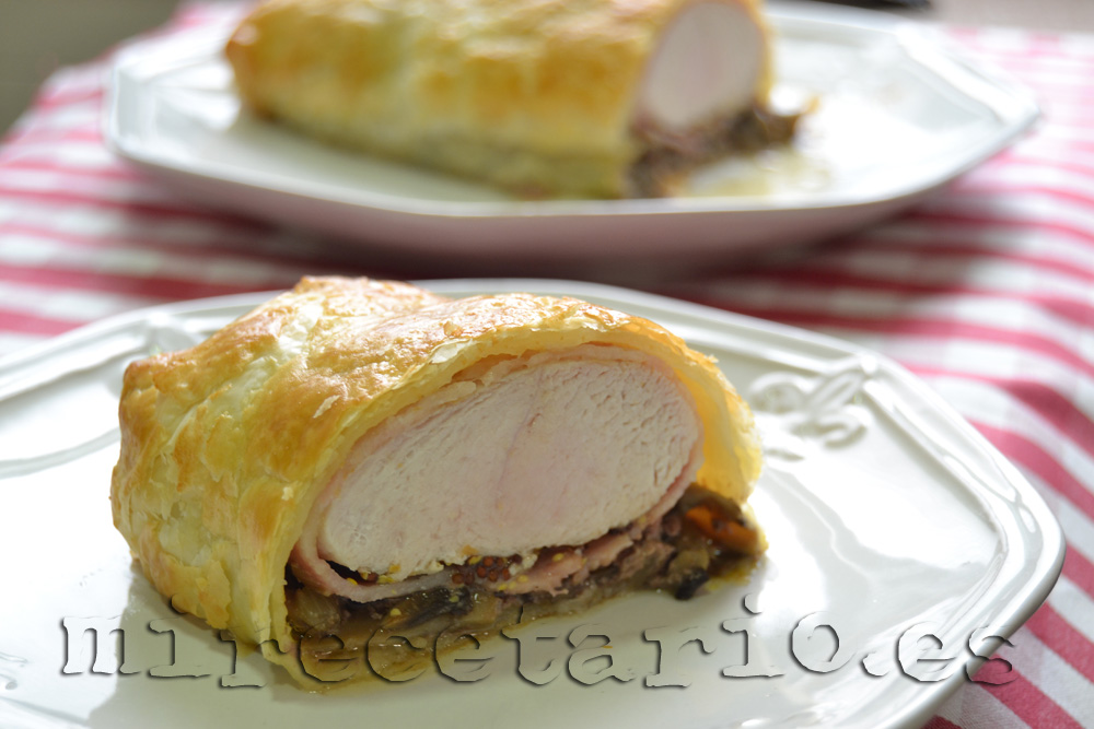 Si es que todo con hojaldre parece de fiesta! da igual que no lleve solomillo, con esas pechugas está estupendo y el sabor de bacon con los champis, un buen relleno.
