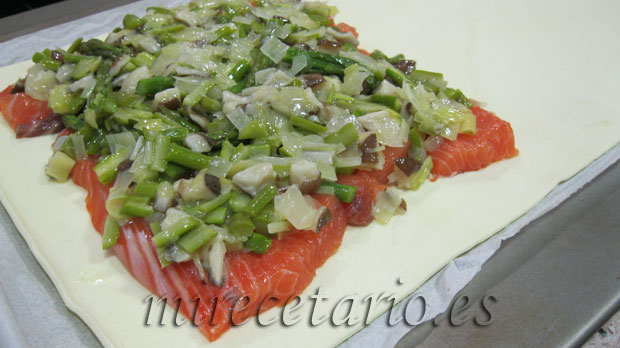 - Extendemos la masa de hojaldre en la bandeja del horno sobre el papel en el que viene envuelta, que en mi caso era una lámina de hojaldre fresca que venden enrolladas en Lidl a 1,19€, poner el salmón salpimentado en un extremo, poner las verduritas salteadas encima y cubrir con el resto de lámina de hojaldre que nos queda vacía (ver foto del paso a paso).