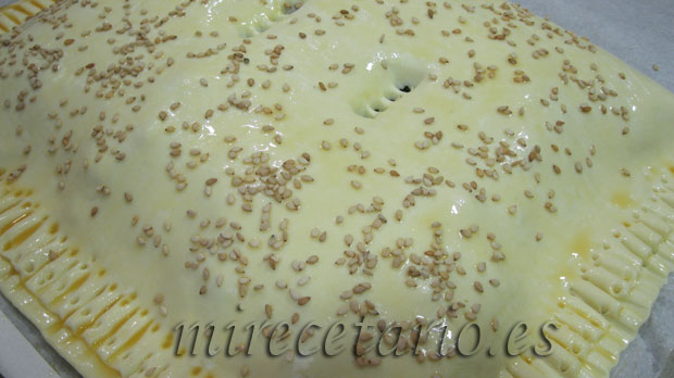 - Para cerrar bien el paquetito, pincelar con huevo batido y luego presionar con un tenedor como si estuviésemos haciendo empanadillas, pintar toda la superficie de huevo batido, espolvorear con semillas de sésamo y finalmente, hacer unas chimeneas pinchando con un tenedor para que salga el vapor de la cocción.