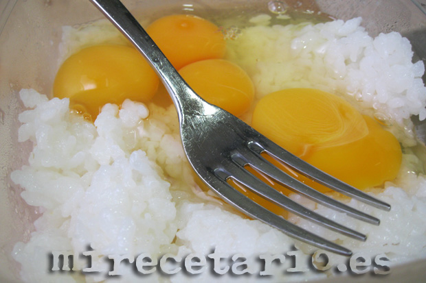 - Ponemos el arroz ya cocido (en mi caso era el sobrante de arroz que preparé para sushi, ¡me pasé tres pueblos!) y le añadimos los huevos, la nata y el trocito de pastilla de caldo de pescado y mezclamos con un tenedor.