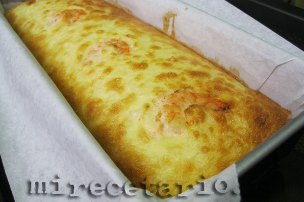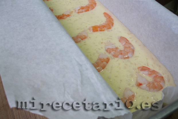 - Ahora vertemos una parte de la mezcla sobre un molde para plum-cake, ponemos unos langostinos pelados y cubrimos con más arroz, volvemos a poner más langostinos y más arroz hasta acabar con todo.
